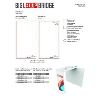 Die BIG LEDUP® Bridge ist eine innovative Lösung zur Verbindung eines freistehenden Rahmens (Breite: 100cm; Höhe: wahlweise 200cm, 230cm, 248cm oder 298cm) mit einem bestehenden BIG LEDUP® System. Dies erfolgt über einen oben liegenden Brückenrahmen mit ebenfalls 100cm Breite und einer Brückenlänge von 200cm, 230cm, 248cm oder 298cm.